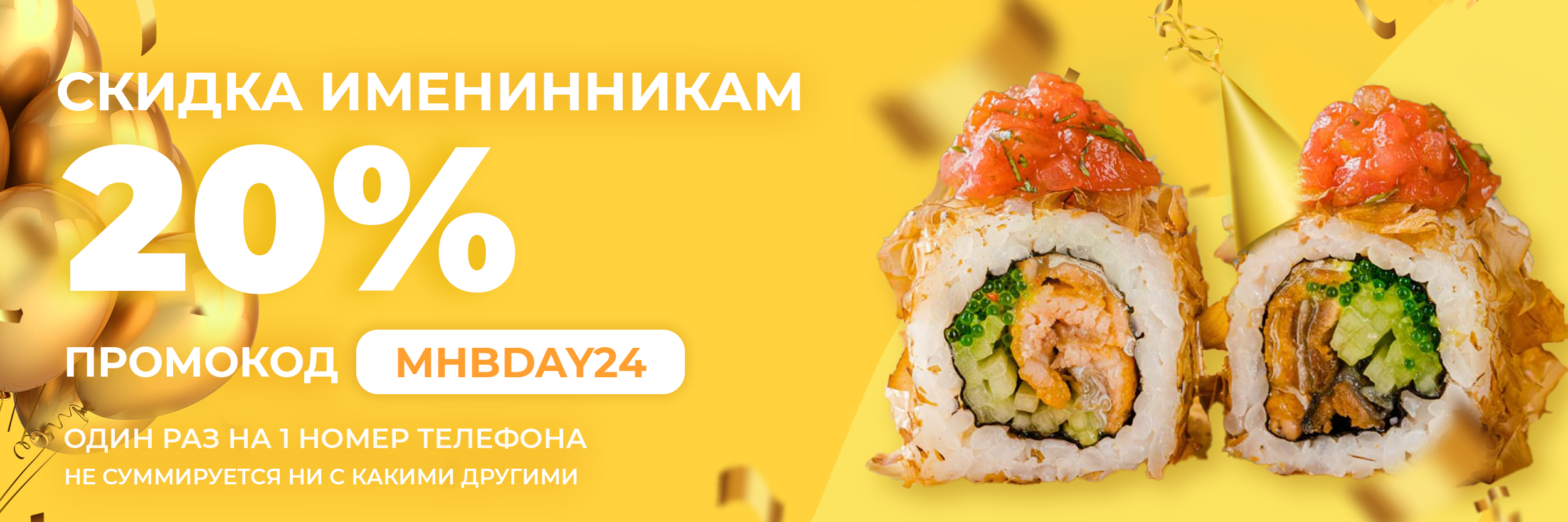 Всем именинникам мы дарим скидку 20% на все меню по промокоду "MHBDAY24".